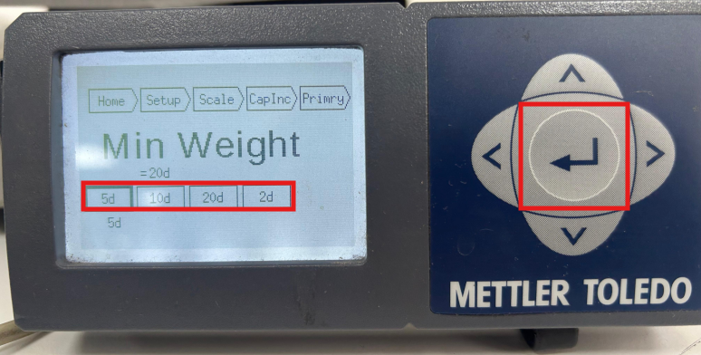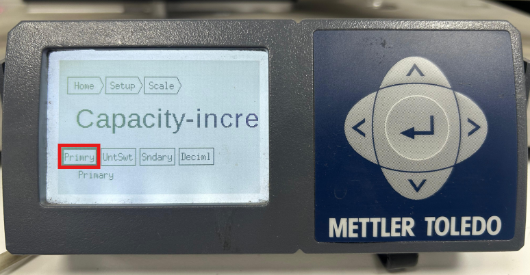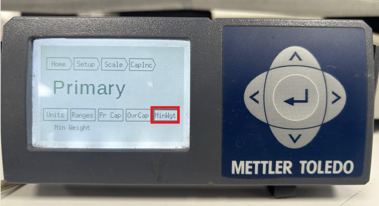 Up Arrow (3 Sec) -> Setup-> Scale-> (Cal) CapInc-> Primry-> MinWgt (Select Weight)-> Home-> End -> Save (Exit)