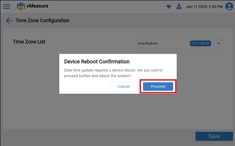 Step 4: Once the Time zone is selected, click the "Proceed" icon in the prompt. On clicking "Proceed" device will reboot.