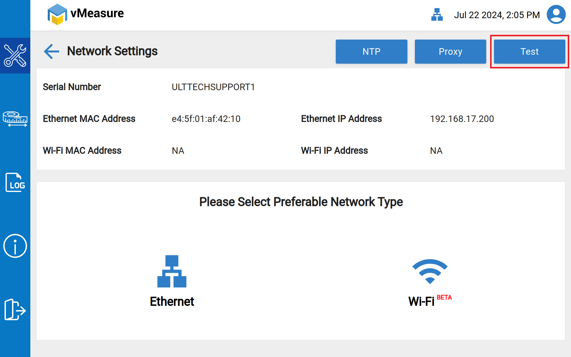 2. After log-in into device, Settings > Network settings, Click on "Test".