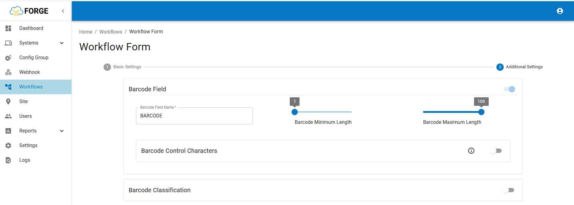 Ensure the minimum barcode length is set to 1 and the maximum to 100. This allows barcode values ranging from 1 to 100 characters to be scanned.