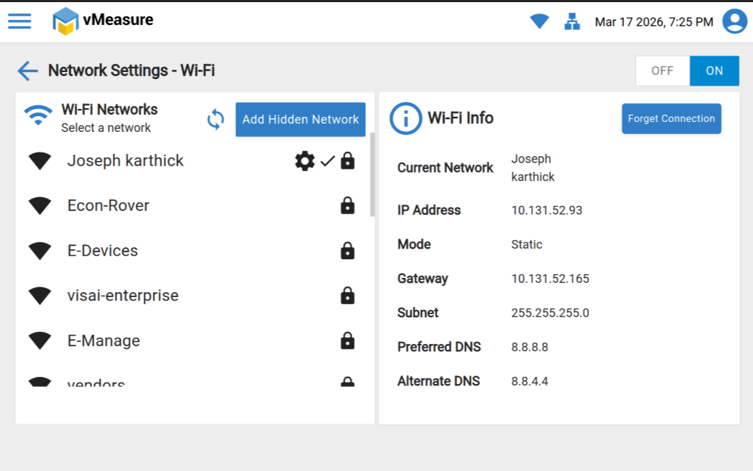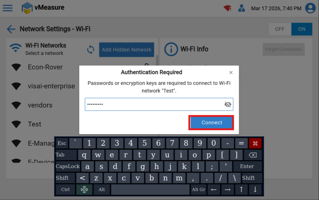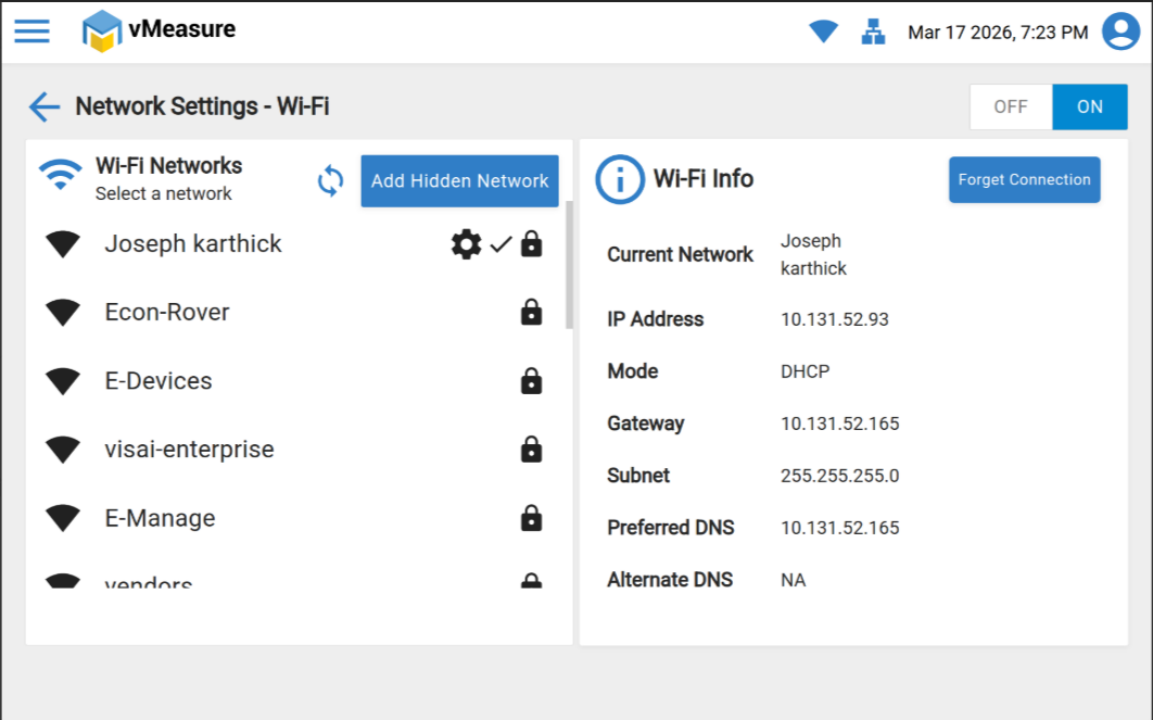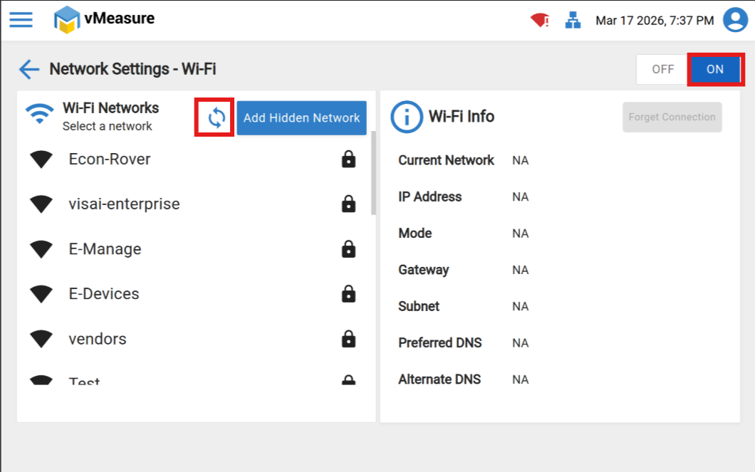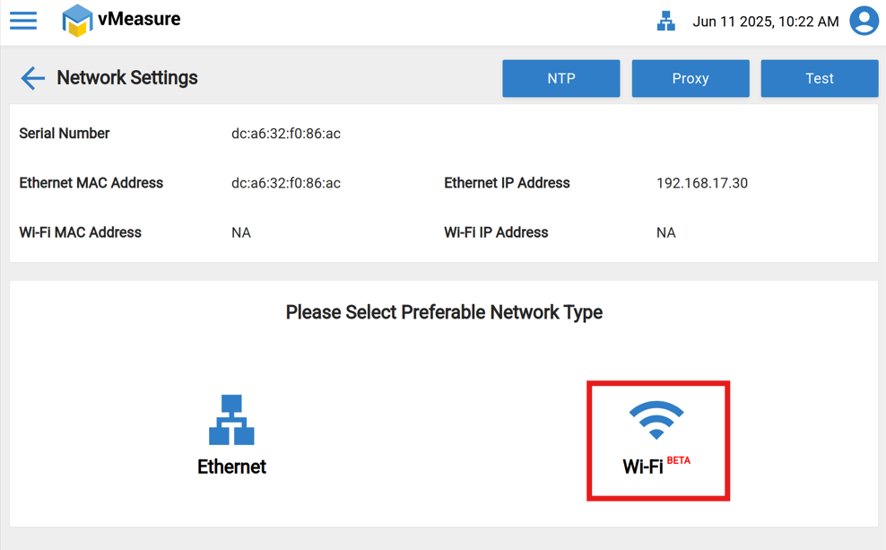 Step 2: "Wi-Fi", make sure the Wi-Fi adaptor is connected to the vMeasure device.